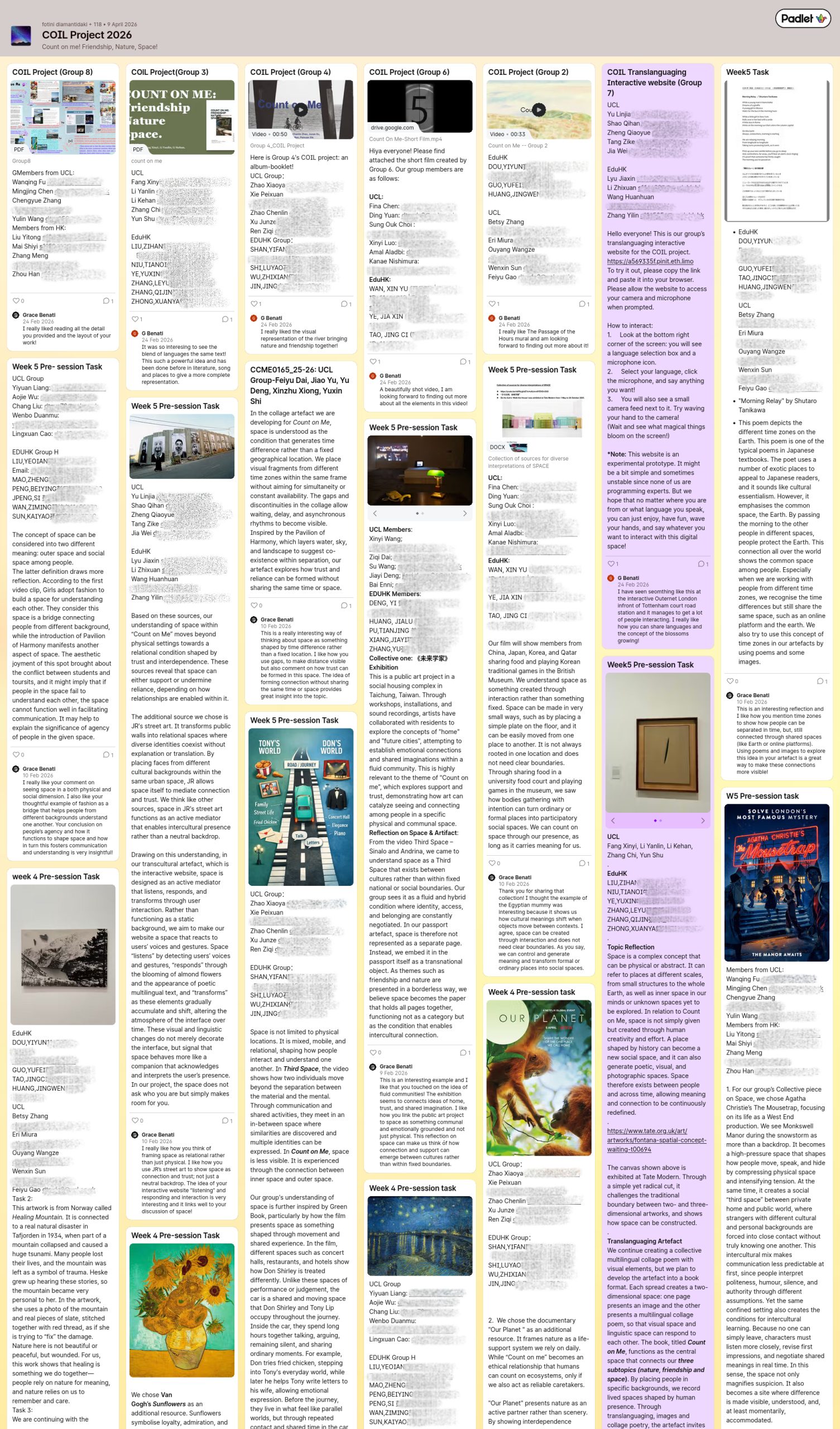 The project launched with a synchronous online launch on 14 January during the UCL session, which brought together participants across four sites and established the foundation for intercultural and inter-institutional collaboration. Following this, MA students across sites and school partners uploaded short self-introduction videos on Padlet and formed transcultural groups. These groups became the core units for collaborative learning and artefact development throughout the project and met weekly to work on the collaborative tasks set by Dr. Fotini Diamantidaki.