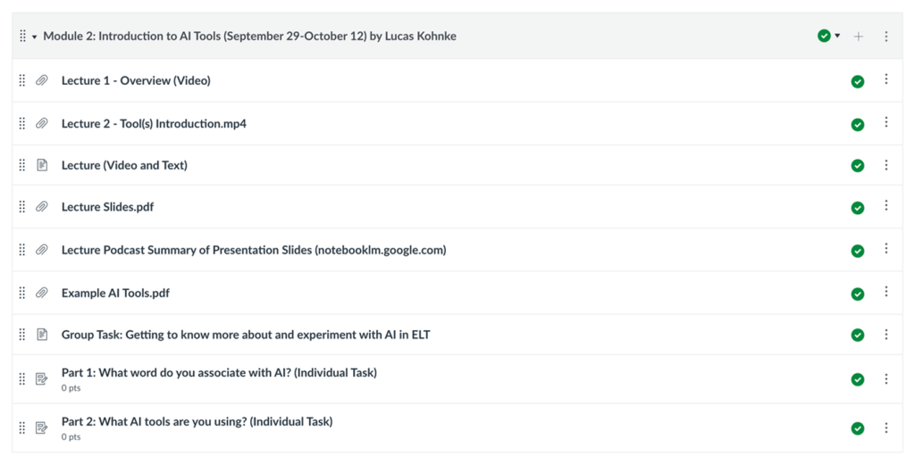 In the virtual exchange program, Dr. Lucas Kohnke facilitated Module 2 “Introduction to AI Tools”, which ran from 29 September to 12 October 2025. This module introduced students to foundational concepts and practical applications of artificial intelligence (AI) in English language teaching (ELT). The session explored why AI tools matter in contemporary ELT, their practical implications for classroom practice, and the evolving role of language teaching in an AI-mediated world. Students were also introduced to the following selection of AI tools: