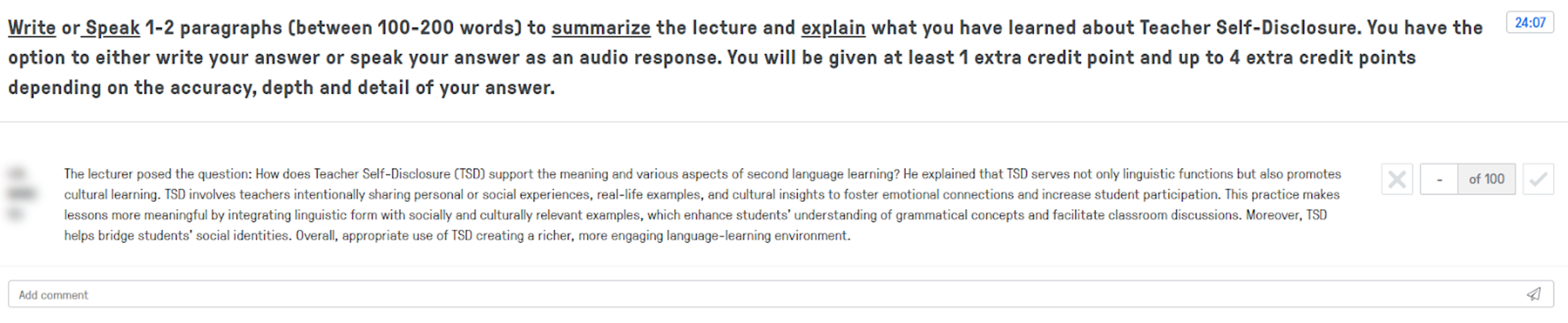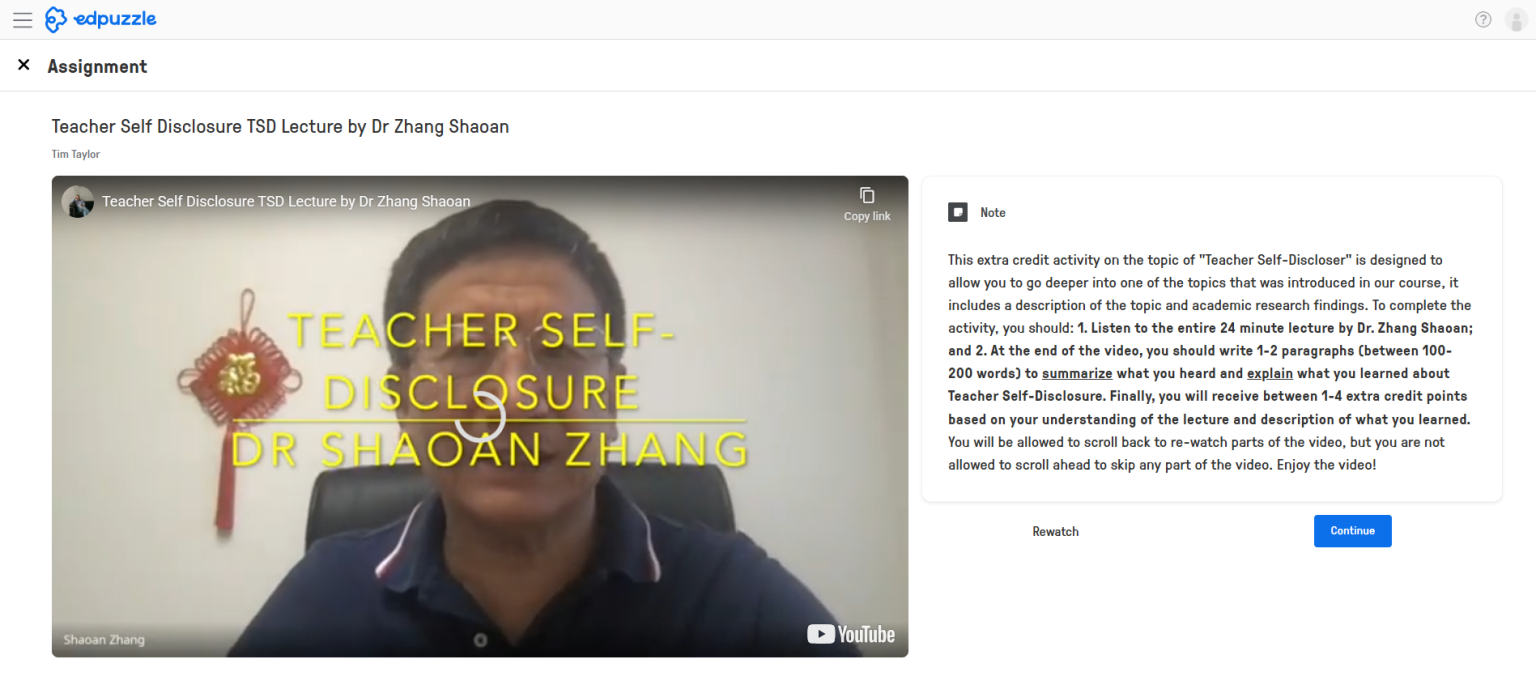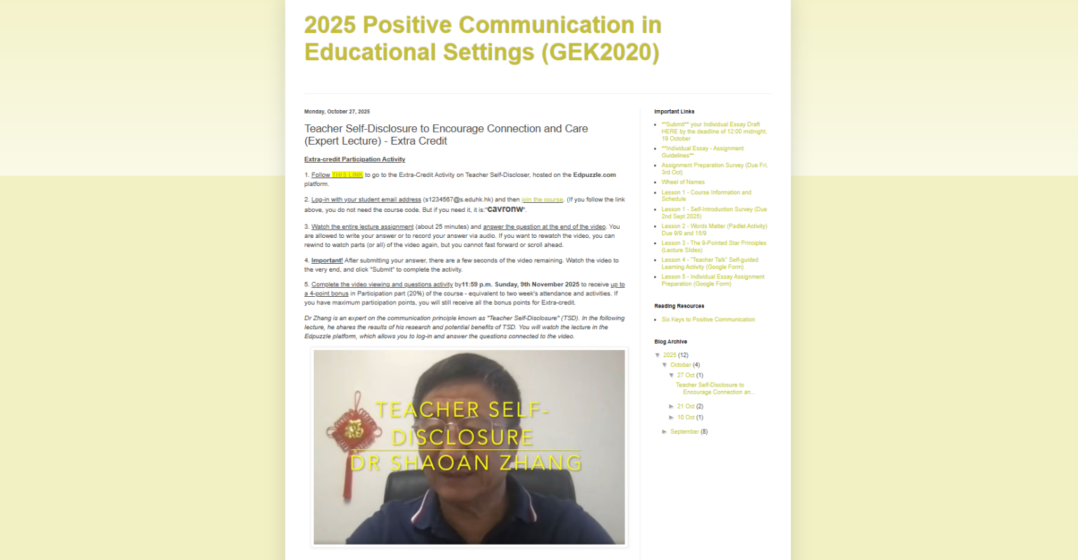 As part of a pre-COIL (Collaborative Online International Learning) initiative to foster strong international partnerships and prepare for future cross-cultural exchanges, students enrolled in the “Positive Communication in Educational Settings” course were offered an optional, in-depth exploration of the topic “Teacher Self-Disclosure” (TSD). Of the 43 students in the class, 26 chose to participate, and 21 successfully completed the activity. Participants accessed a specialized one-hour lecture delivered by Professor Shaoan Zhang, a leading international scholar in teacher education and an established expert on teacher self-disclosure from the University of Nevada, Las Vegas. Hosted on the Edpuzzle platform for flexible, interactive viewing, the lecture provided students with advanced insights into TSD from a globally recognized perspective. Following the lecture, students completed guided reflection questions, designed to take only 10–20 minutes, to articulate their key takeaways and critical reflections on the material. Responses were evaluated on a 0–4 scale (with scores among completers ranging from 1 to 4), and corresponding extra credit participation points were awarded to incentivize thoughtful engagement. This activity served multiple pedagogical goals: it enabled interested students to delve more deeply into a core course theme; introduced an expert, U.S.-based viewpoint to broaden cultural and scholarly horizons; encouraged structured reflection that could facilitate intercultural awareness and dialogue; and established a foundational shared knowledge base for subsequent COIL activities, including planned peer-to-peer discussions between students in Hong Kong and the United States.